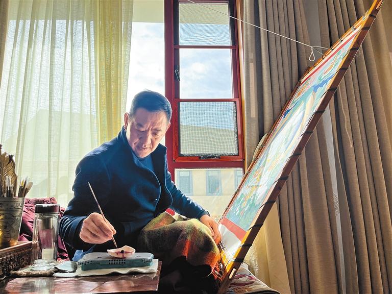 勉冲·罗布斯达作为当代西藏唐卡绘画艺术的代表人物,守正创新是他艺术道路上始终不变的追求。西藏唐卡画院内展示的勉萨派唐卡作品《唐蕃慧心》展现了在唐王朝与吐蕃和亲的历史背景下,汉藏工匠联手建造小昭寺的历史场景,该作品入选了中宣部文化名家暨“四个一批”人才自主选题资助项目。