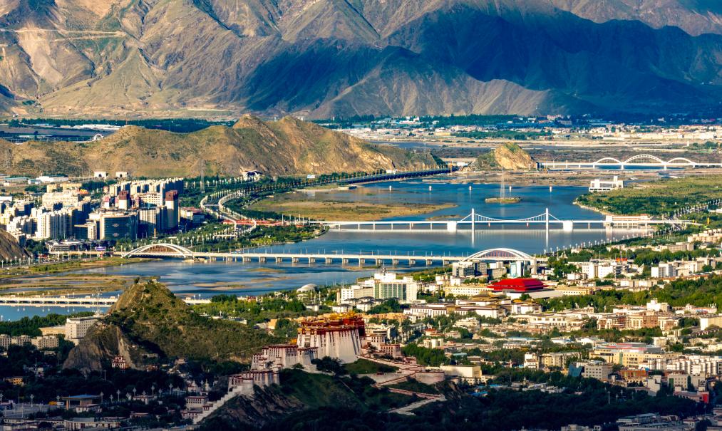 2025年7月30日,拉萨河风光。由近及远分别是连心桥、柳梧大桥、和美桥和青藏铁路拉萨河特大桥。(新华社记者 姜帆 摄)