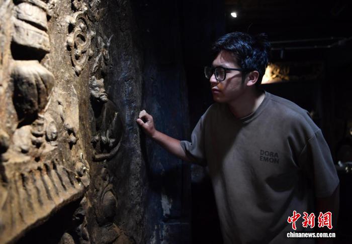 乡城县宗萨木府的主人洛绒泽仁介绍藏式香巴拉猫泥塑。记者 王磊 摄