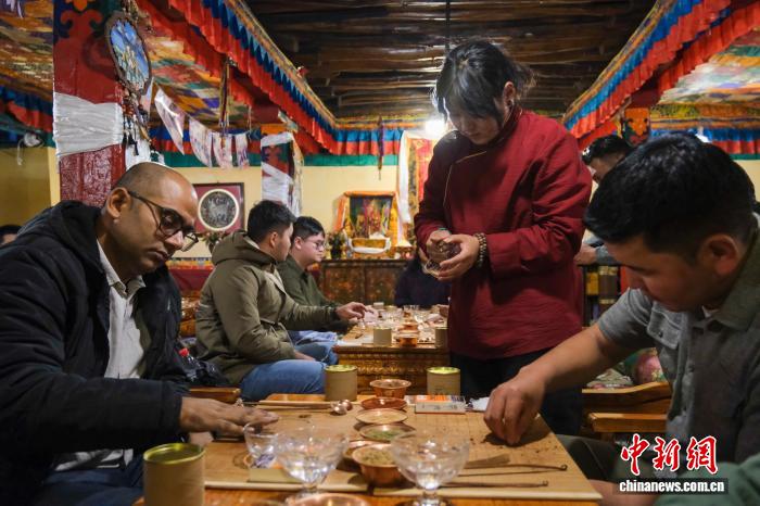 9月18日,多国媒体人员、公务人员在拉萨八廓街邦达仓古建大院体验手工藏香制作。中新社记者 江飞波 摄
