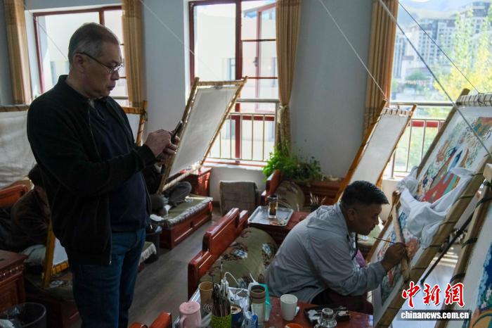 9月26日,哈萨克斯坦驻华大使努雷舍夫在西藏唐卡画院观看了解唐卡绘制过程。中新社记者 江飞波 摄