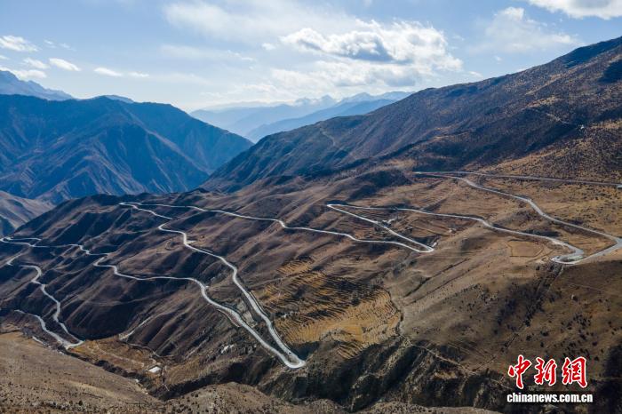 2023年1月16日,川藏公路西藏昌都段著名的“天路72拐”,该路段以高海拔、急弯、大落差等复杂惊险路况被人熟知。(无人机画面)中新社记者 江飞波 摄