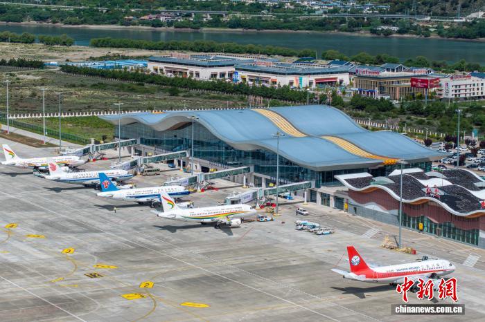 2025年6月,西藏林芝米林机场停靠航班。该机场现运营15条航线,通达北京、成都及广州等9座城市。(中国民用航空西藏自治区管理局供图)