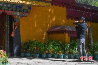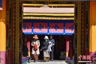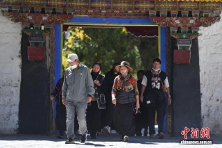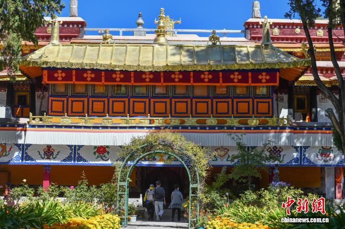 图为游客在罗布林卡内游览金色颇章。贡确 摄