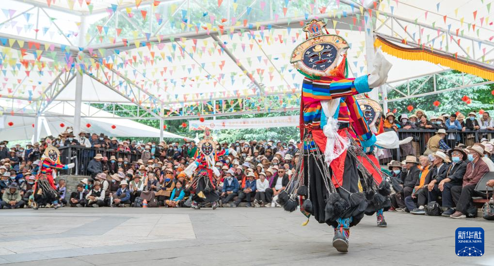 伴随着高亢悠长的唱腔和铿锵的鼓点,演员们身着华丽服饰,佩戴鲜艳面具,踏着古朴舞步,在距离西藏自治区首府拉萨东南约100公里的山南市昌珠镇扎西曲登社区,上演一出出古老藏戏剧目。