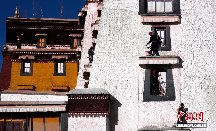 西藏布达拉宫22日迎来一年一度的粉刷“美颜”,民众自发参与粉刷工作。