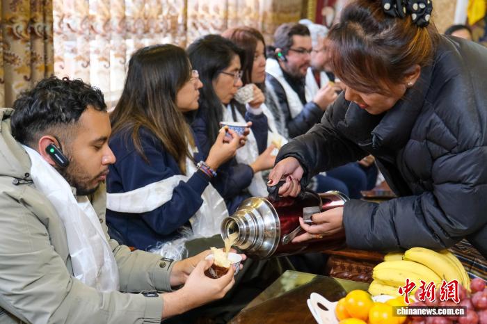10月31日,来自哥伦比亚、智利、危地马拉等18个拉美国家的21名记者在拉萨居民家中参访,品尝高原甜茶、酥油茶等。中新社记者 江飞波 摄