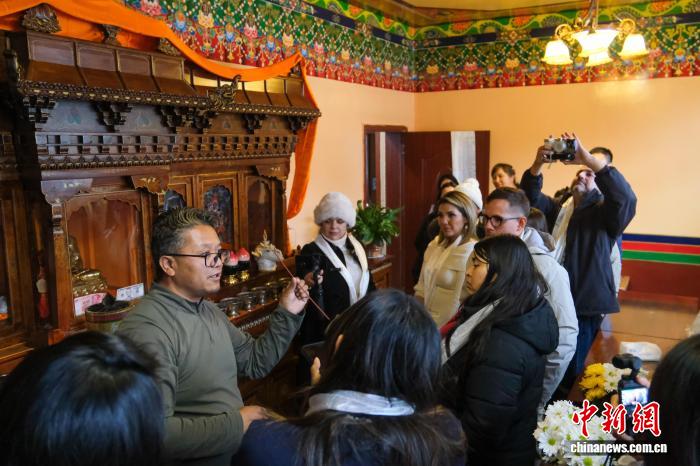 “在西藏,藏传佛教信众家家都有一间房子用来做佛堂,我们日常的供佛、礼佛都在这里进行。”近日,拉萨慈觉林村藏族村民、导游旺堆在自家佛堂对来自哥伦比亚、智利、危地马拉等18个拉美国家的21名记者介绍说。