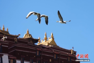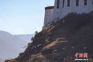 图为斑头雁与布达拉宫同框。贡确 摄