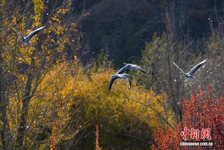 图为斑头雁从宗角禄康公园上方飞过。贡确 摄