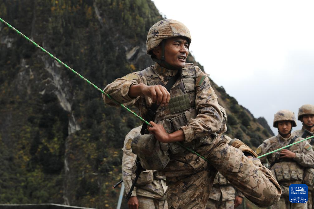 2025年11月2日,巡逻途中,西藏军区某团一级上士次罗布(右一)和战友们跋山涉水。新华社发(于达 摄)