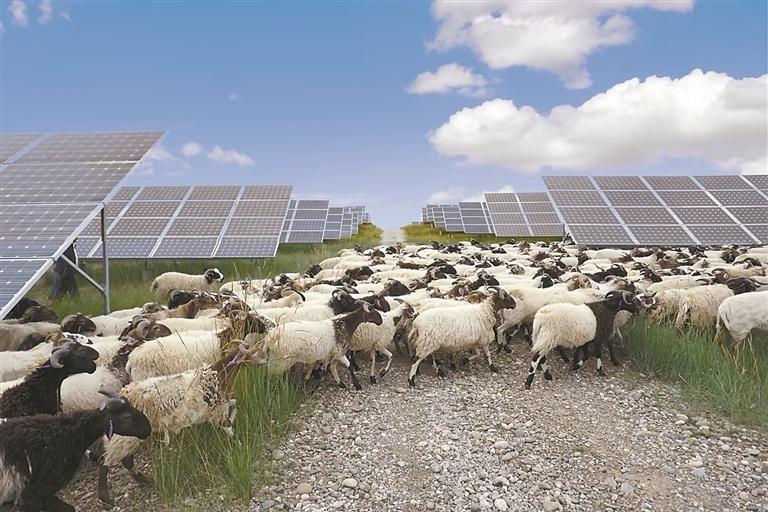 为方便羊群活动,黄河公司在后续建设中,特意将光伏板间距从3米扩大到5米,支架高度从0.5米抬高到1.2米,真正为羊群打通“绿色通道”,实现“板上发电、板下牧羊”。