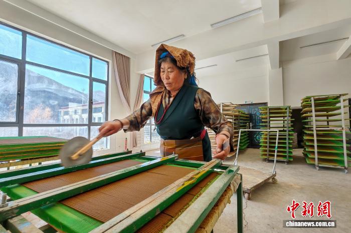 11月26日,西藏尼木县吞巴镇一藏香公司,54岁的农牧民嘎玛普琼正在使用机器生产藏香。中新社记者 江飞波 摄