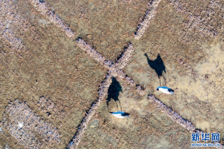 12月19日,在西藏日喀则市南木林县的雅鲁藏布江河畔田间觅食的黑颈鹤(无人机照片)。新华网 旦增努布 摄