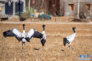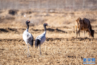 12月18日,在西藏日喀则市南木林县田间觅食的黑颈鹤。新华网 旦增努布 摄