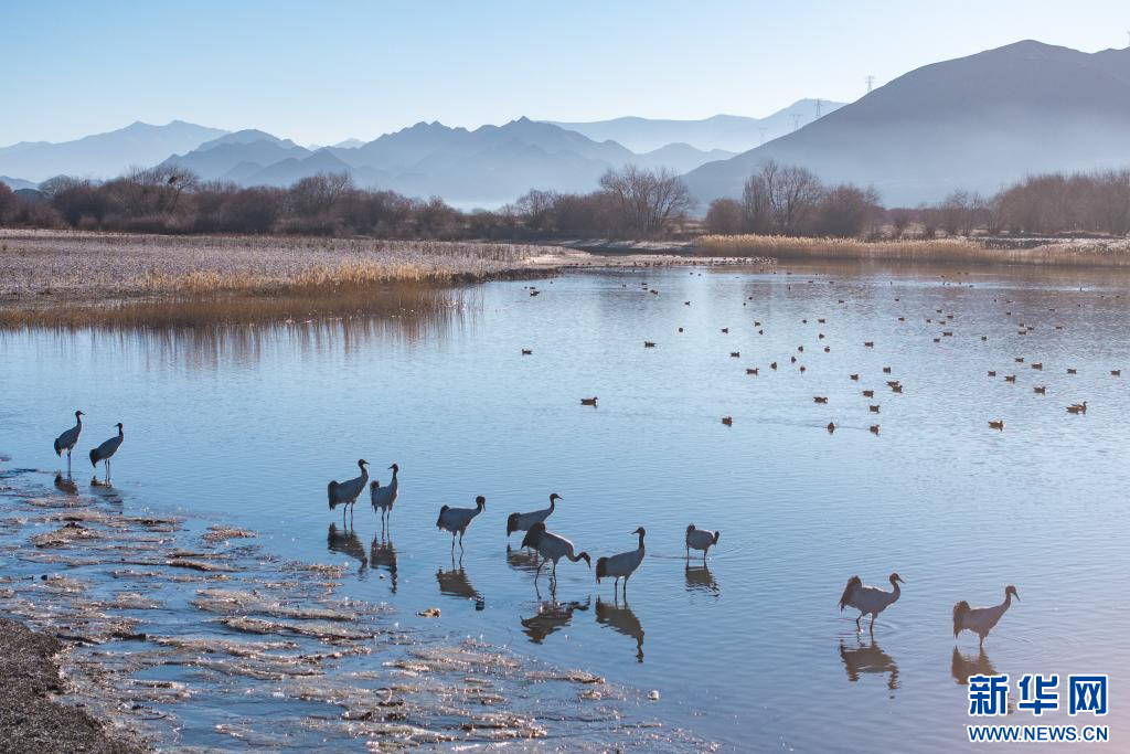 12月18日,在西藏日喀则市南木林县境内拍摄的黑颈鹤。新华网 旦增努布 摄