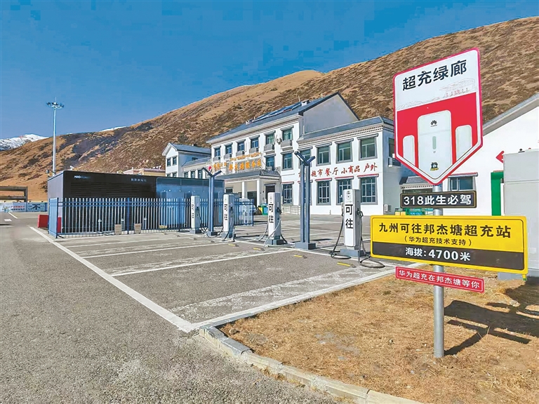 邦杰塘服务区停车场内的新能源汽车快充桩。通讯员 张成 多吉 摄