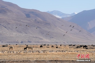 图为森嘎村境内的农田里斑头雁在觅食。中新社记者 贡嘎来松 摄