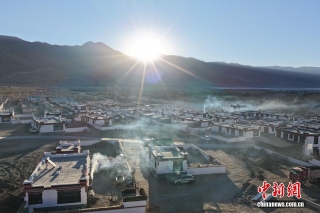 图为重建后的森嘎村清晨炊烟袅袅。(无人机照片)中新社记者 贡嘎来松 摄