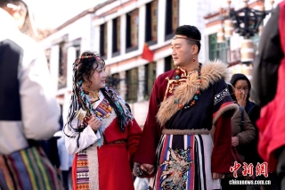 12月24日,游客在拉萨市八廓街拍摄藏服写真。中新社记者 李林 摄