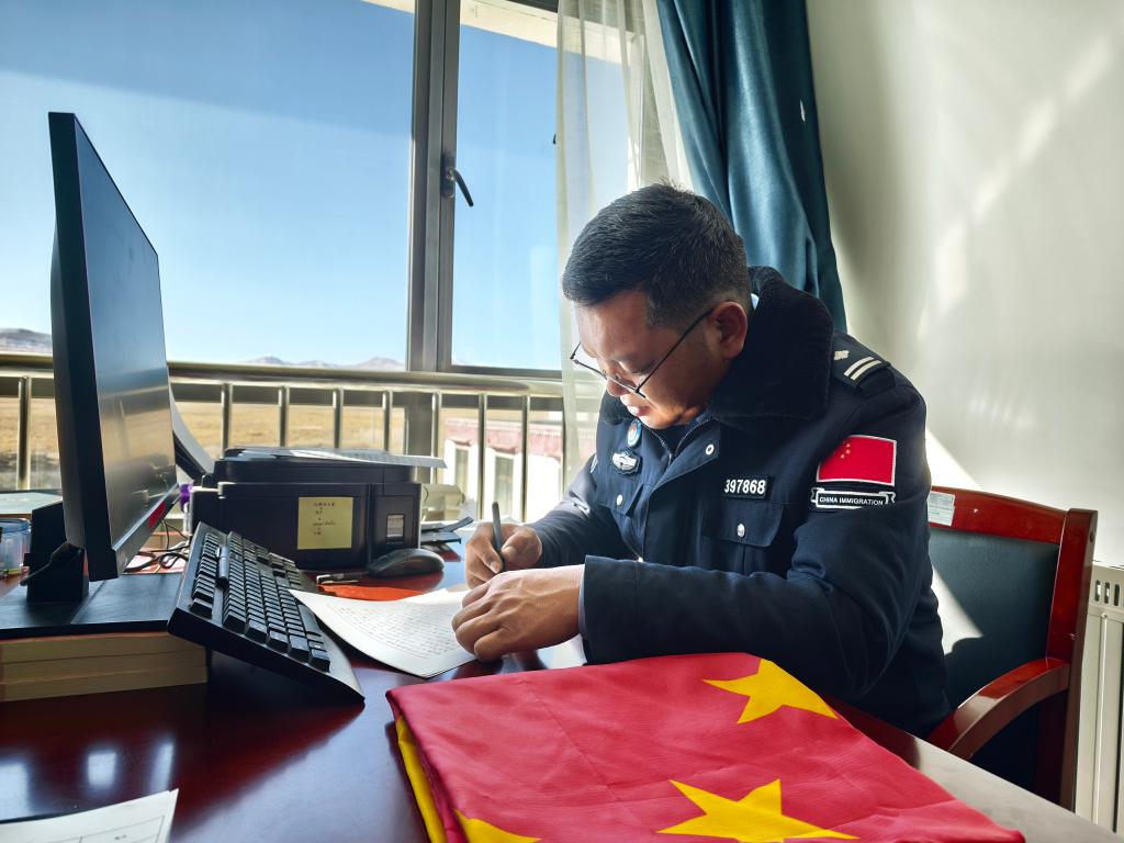 普玛江塘边境派出所所长普布扎西为海南大学爱心艺术团回信。(普玛江塘边境派出所供图)