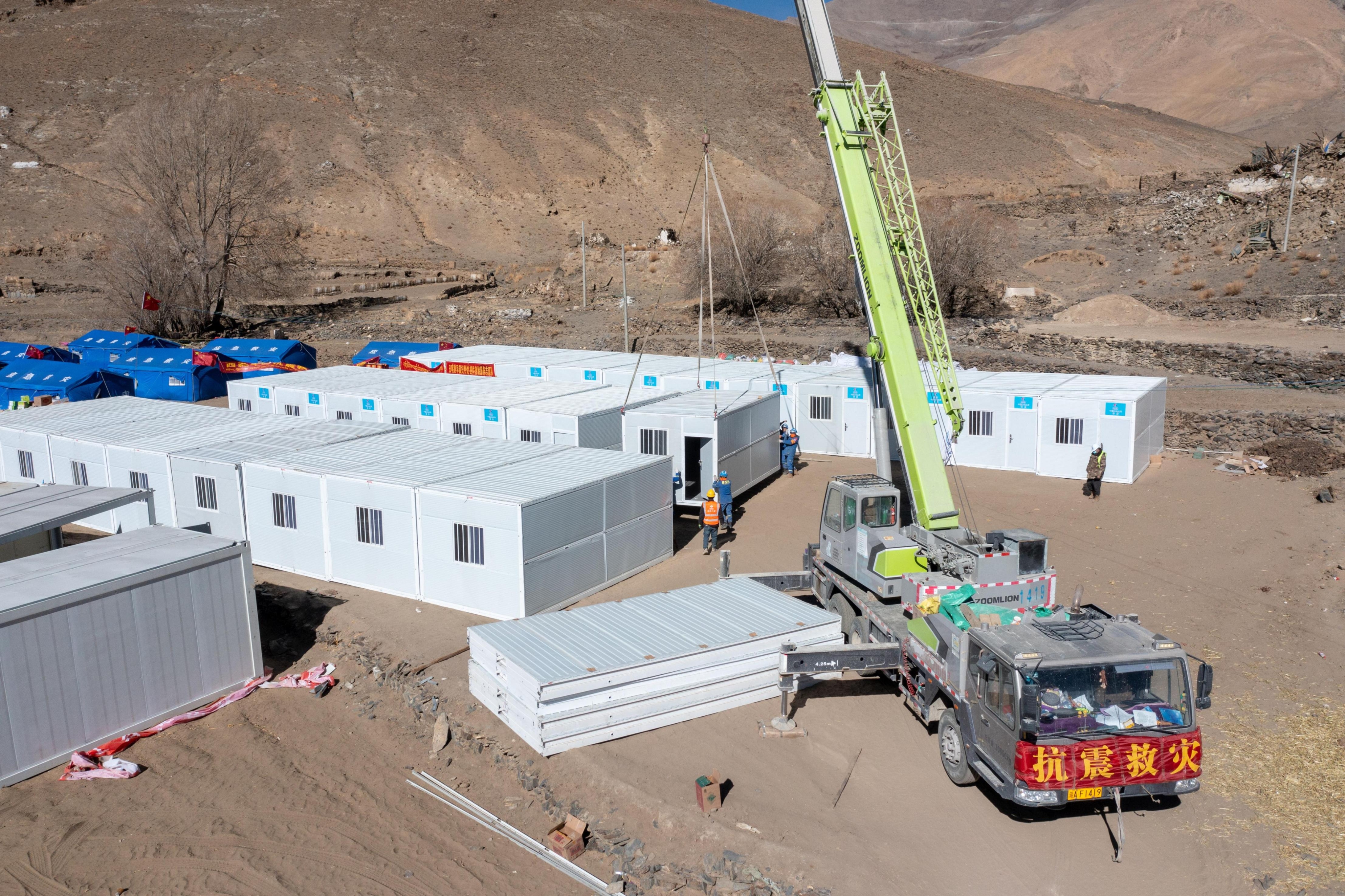 2025年1月9日,在定日县长所乡古荣村安置点,救援人员和施工人员合力抓紧搭建移动板房,确保受灾群众温暖过冬。人民网记者 翁奇羽摄