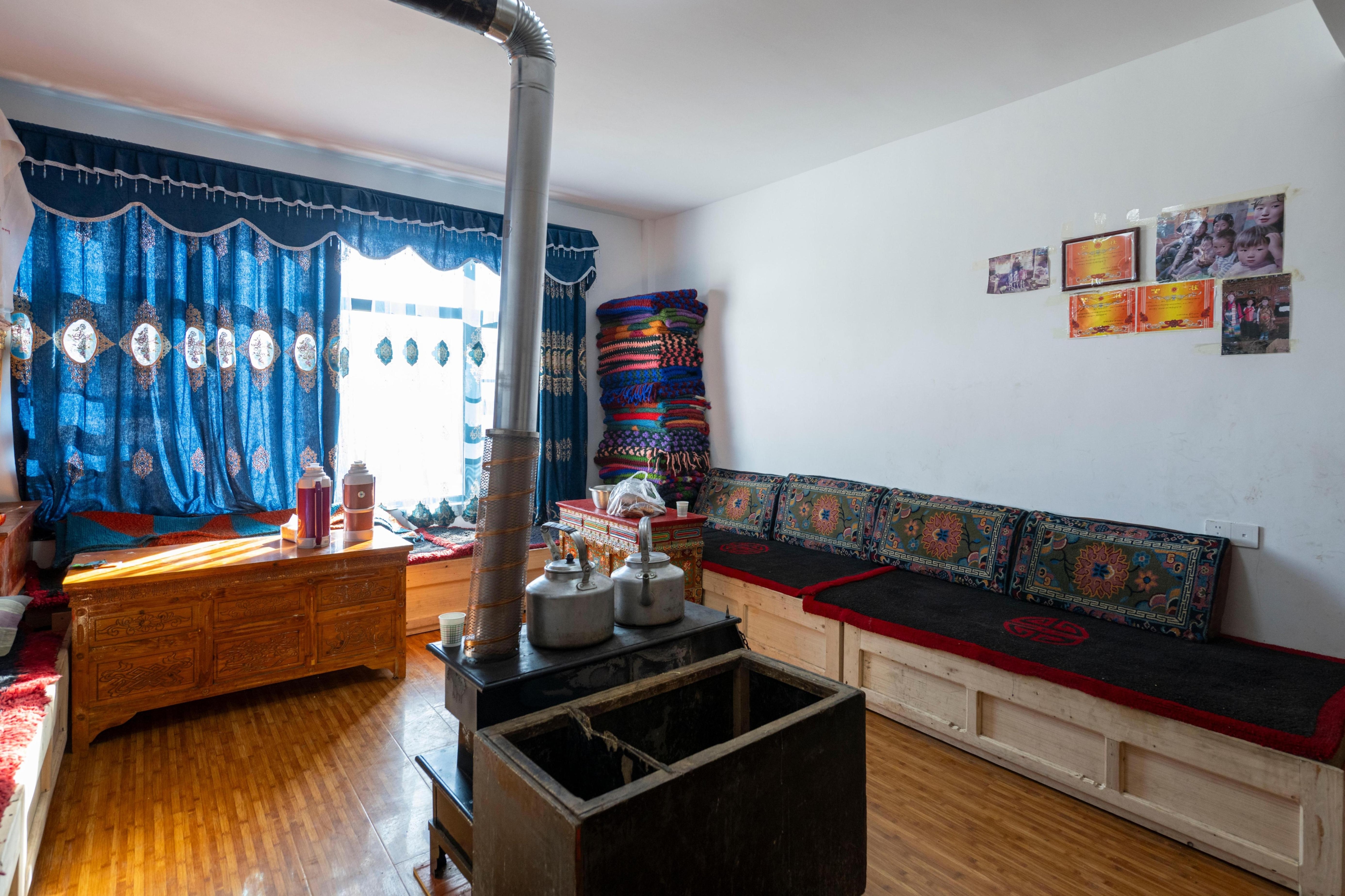 外墙刷着洁白的石灰,窗框上绘制的五彩吉祥图案,承载着独有的文化韵味与美好期许。走进屋内,藏式家具摆放得整整齐齐,墙上悬挂的几幅唐卡色彩艳丽,处处透着新生活的气息。