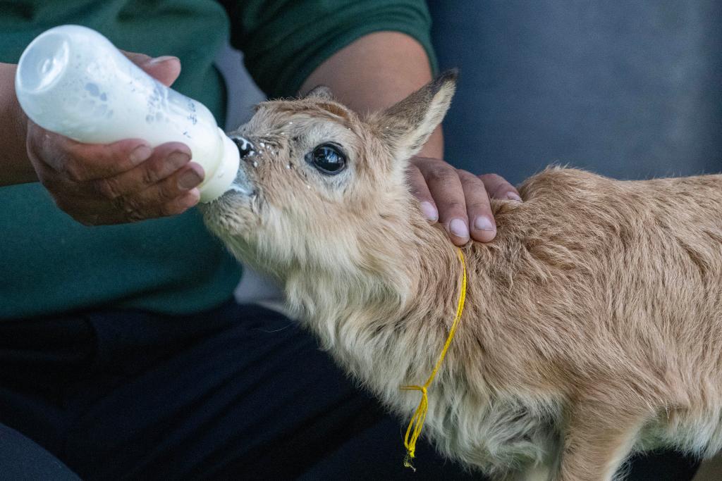 措罗木管理站站长阿旺洛卓在给藏羚羊幼崽喂奶(2025年7月16日摄)。