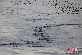 1月18日,成群的赤嘴潜鸭在沉错水域越冬。中新社记者 贡嘎来松 摄