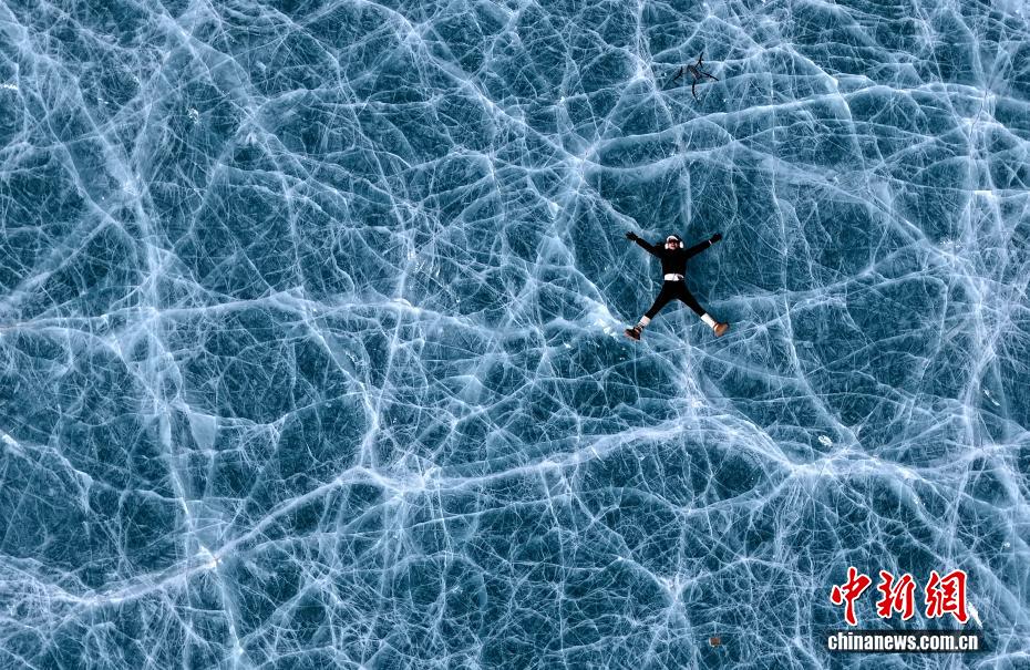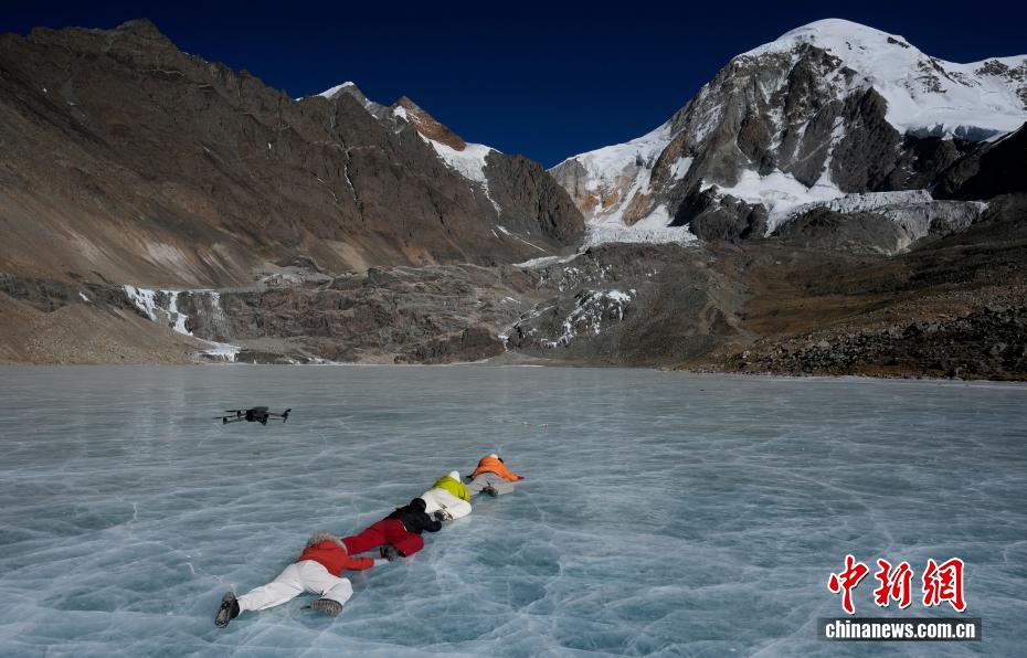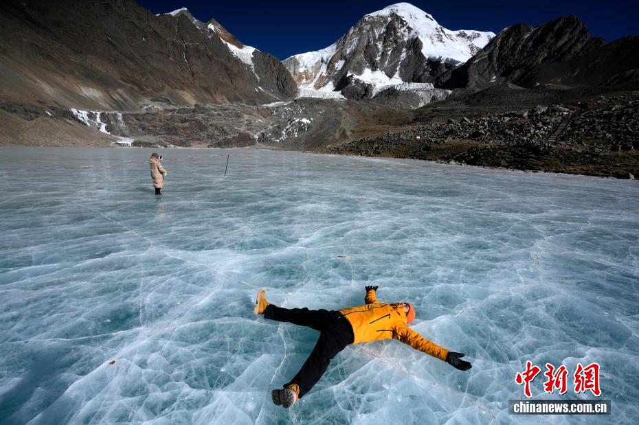 1月16日,游客在琼穆岗嘎雪山脚下的冰湖拍照。中新社记者 李林 摄