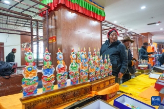 2月12日,在拉萨市八廓商城,手工艺人在摊位前推销酥油花。新华社记者 丁增尼达 摄