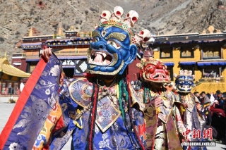 图为楚布寺僧人们佩戴面具表演。中新社记者 贡嘎来松 摄