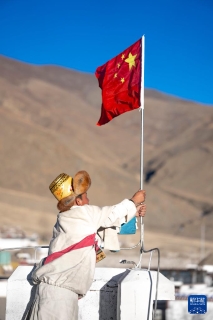 2月16日,长所乡古荣村村民桑杰将一面崭新的五星红旗立在新居屋顶。