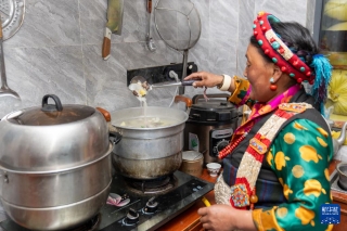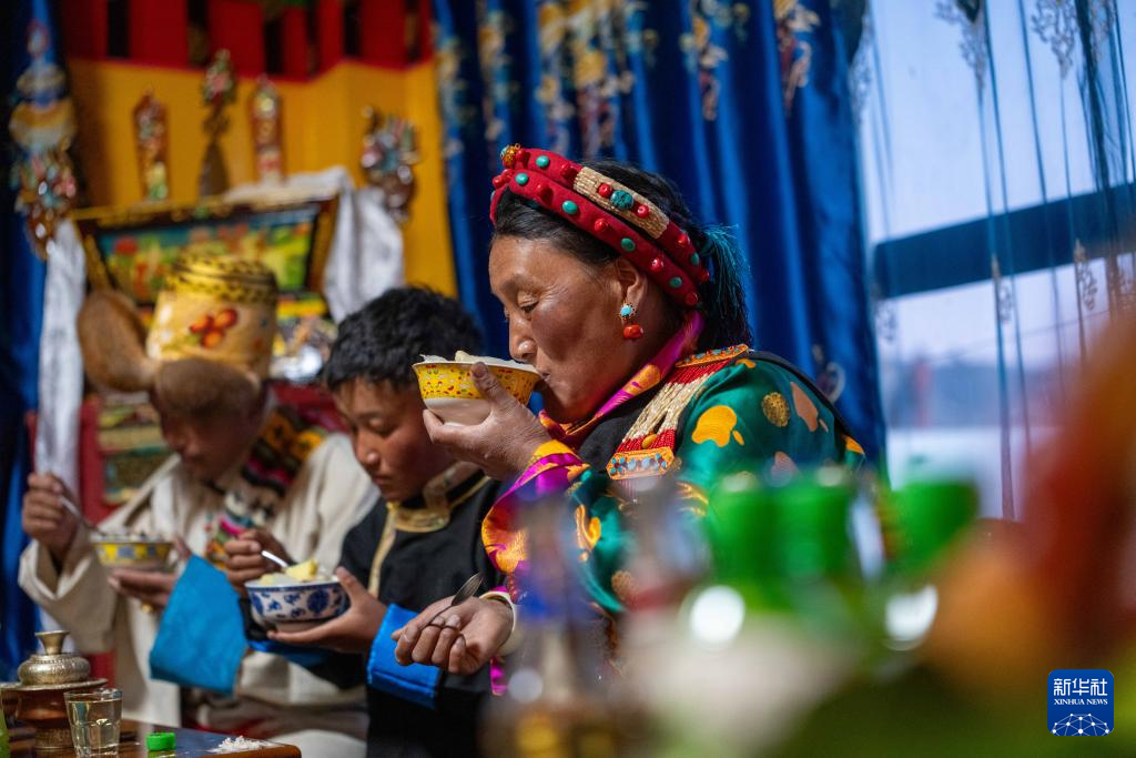 2月16日,长所乡古荣村村民桑杰(右一)与家人一起吃年节食品“古突”。在藏语中,“古”意为“九”,“突”意为“面”,“古突”是一种用牦牛肉汤加入牛肉、萝卜、奶渣等食材熬煮的面食。按西藏传统习俗,“古突”夜,家家户户迎来团聚,一起享用“古突”。