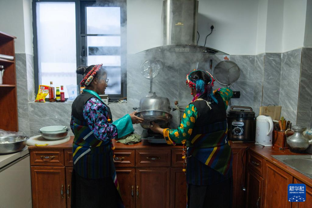2月16日,长所乡古荣村村民桑杰的大女儿旦增旺姆(右一)给奶奶次仁塔决倒茶。