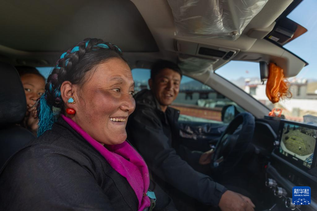2月16日,长所乡古荣村村民桑杰(右)带着爱人卓玛次仁和小女儿旦增格央去买年货。