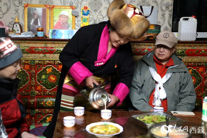 扎西曲登社区的居民在家中热情招待远道而来的游客。居民身着盛装,为游客倒上热腾腾的酥油茶,桌上摆放着切玛与特色美食,宾主共话民族团结情谊。人民网记者 吴雨仁摄
