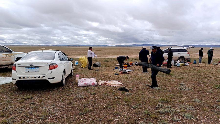 2025年8月,曲麻莱县勒池村藏羚羊迁徙护航队在护航途中搭帐篷。新华社发