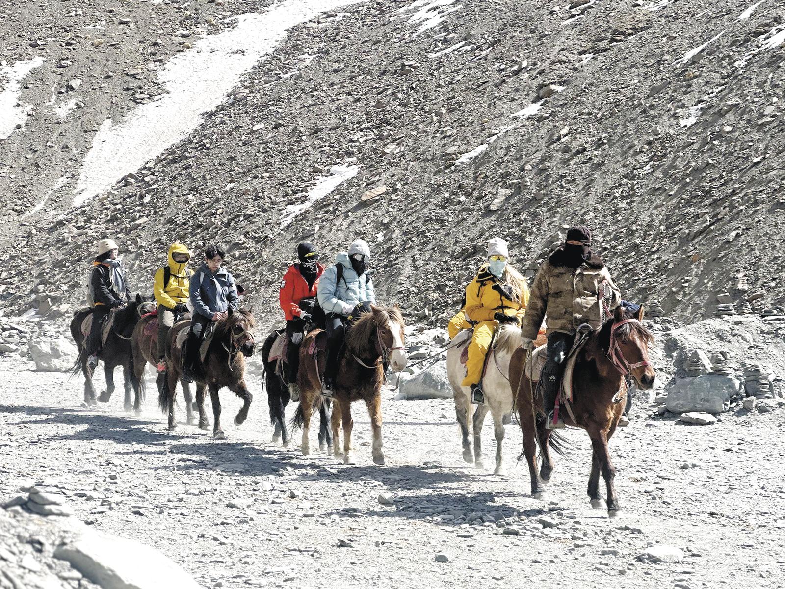行进途中,向导始终走在马队最前方,手中牵引着头马,不时回头扫视队伍。为了让马群在崎岖的山路上保持整齐队形、避免拥挤,每次登山前,工作人员都会细心地将后一匹马的缰绳,牢牢系在前一匹马的尾鞍上。缰绳相连、步调一致,马蹄踏过碎石路,稳稳载着游客向雪峰深处前行。
