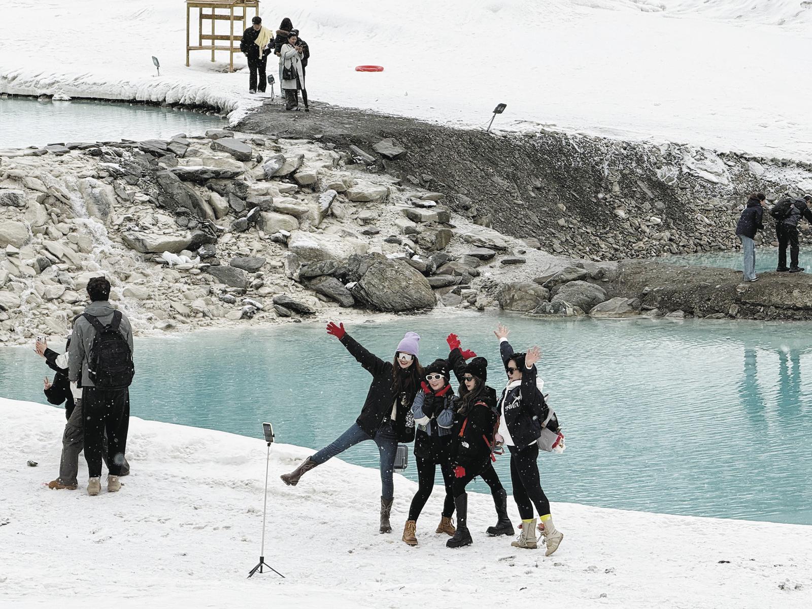 景区持续升温的热度,也带火了当地特色旅游体验项目。“上山的时候身体要向前倾、脚要踩实,防止后仰……”七彩瀑布前方的马队旁,工作人员正贴心地为来自上海、武汉等地的游客手把手指导上马姿势,细致叮嘱雪山骑行的注意事项。
