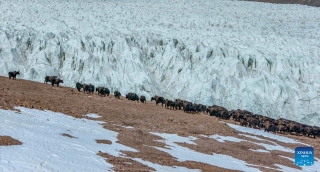 这是在藏色岗日冰川附近拍摄的野牦牛群(3月16日摄)。新华社发(四郎江村摄)