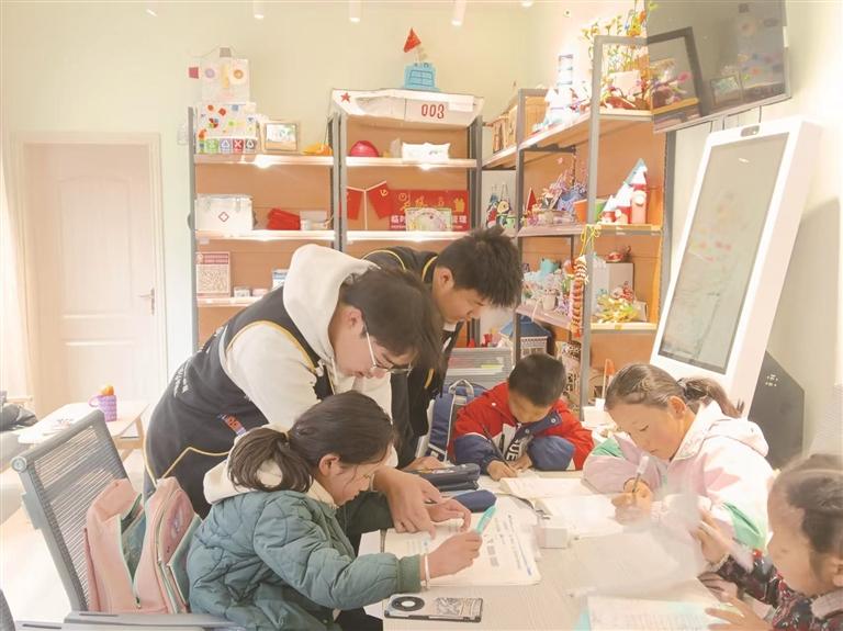 “社区爸爸”在辅导孩子们写作业。图由白玛岗社区提供