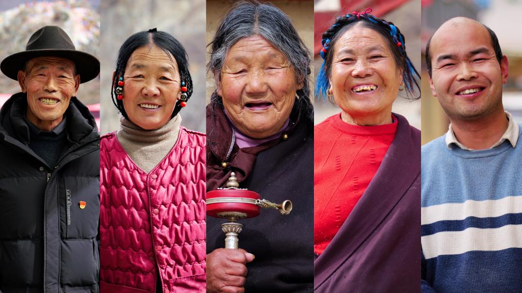 这张拼版照片显示的是生活在岗托村的人们,(从左向右)多嘎、玉珍、布珠、江卓、魏泽潘(2月8日摄)。新华社记者 格桑朗杰 摄