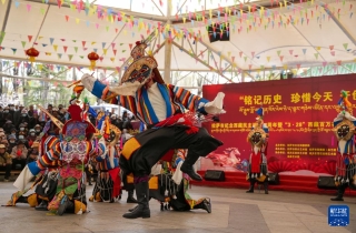 3月28日,演员在拉萨市宗角禄康公园内举办的西藏百万农奴解放纪念日群众演出活动上表演。新华社记者 晋美多吉 摄