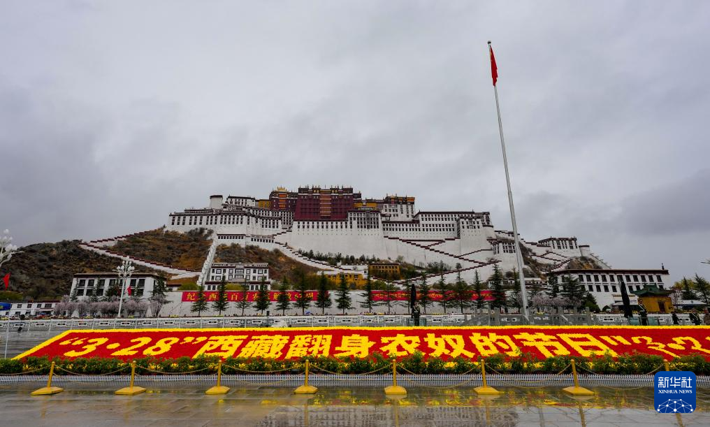 3月28日,布达拉宫广场举行升国旗仪式,隆重纪念西藏百万农奴解放67周年。新华社记者 丁增尼达 摄