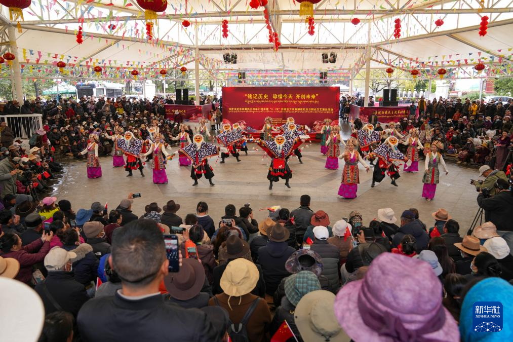3月28日,演员在拉萨市宗角禄康公园内举办的西藏百万农奴解放纪念日群众文艺演出活动上表演。新华社记者 姜帆 摄