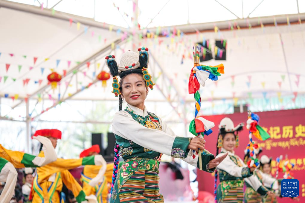 3月28日,演员在拉萨市宗角禄康公园内举办的西藏百万农奴解放纪念日群众文艺演出活动上载歌载舞。新华社记者 晋美多吉 摄