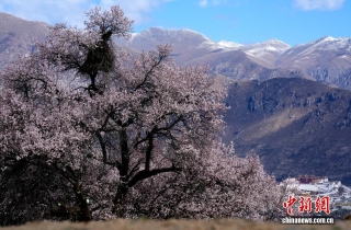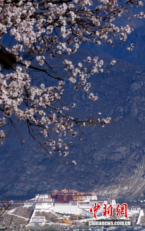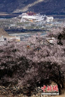 4月1日,西藏拉萨慈觉林村盛开的桃花与布达拉宫交相辉映。西藏拉萨河南岸的慈觉林村古桃树迎来盛花期,与布达拉宫构成春日美丽画卷。中新社记者 李林 摄