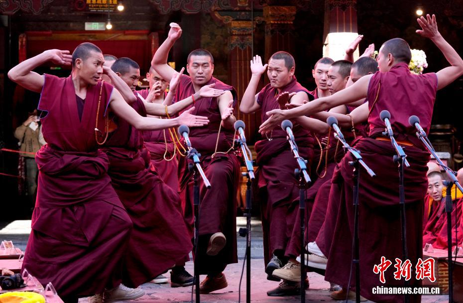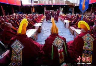 图为陪考僧人围绕藏传佛教五部经典向考僧提问。中新社记者李林摄