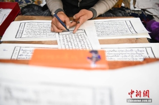 4月21日,西藏雪堆白技工学校手工艺人在整理雕刻修复技艺内容。中新社记者 贡嘎来松 摄